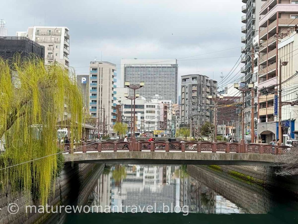 從文明堂總本店沿春雨通往觀光通方向緩步上坡,途中經過中央橋見垂柳及街景倒映在中島川,特別有韻味。