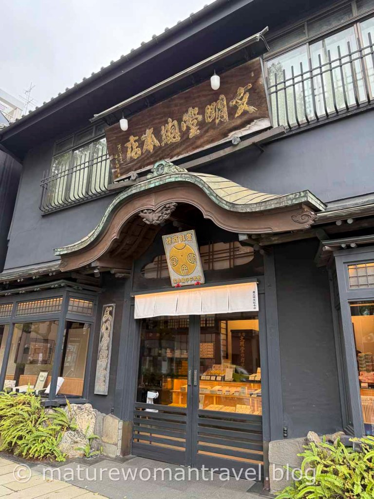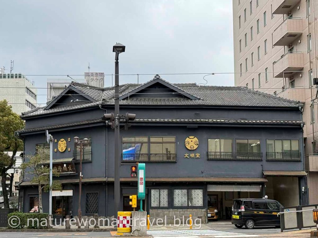 從出島過橋到大波止,老字號文明堂總本店佇立在街角,相當有年代的傳統日式建築,入店內選購各式口味的長崎蜂蜜蛋糕及銅鑼燒。