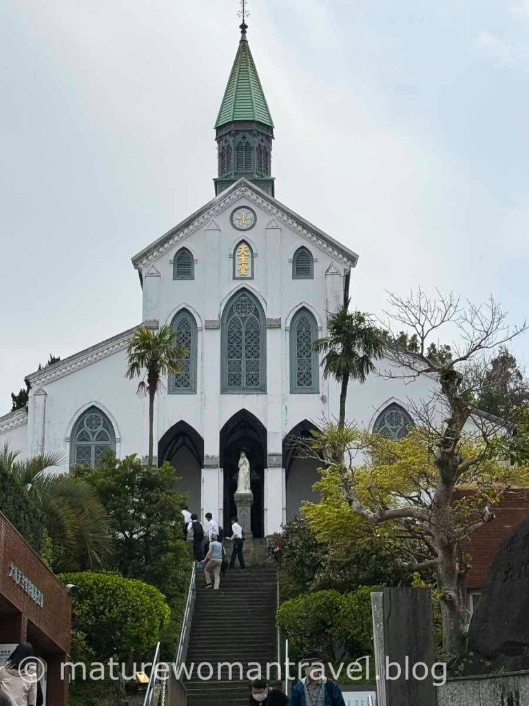 商店街轉角處矗立著白色的大浦天主堂,莊嚴的西式天主教堂,建於 1865 年,擁有彩繪玻璃和雕塑。