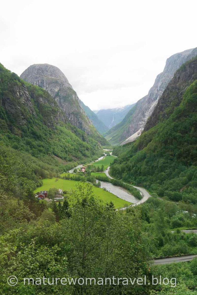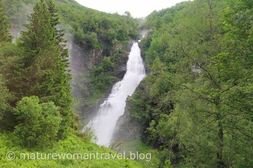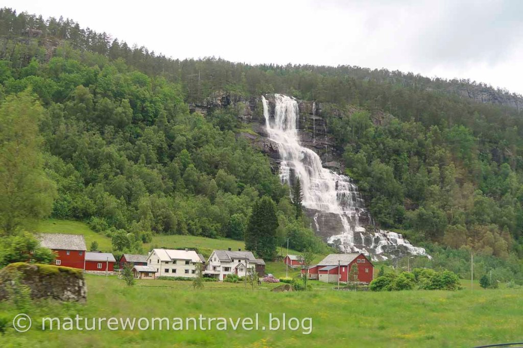 從沃斯(Voss)搭巴士前往Gudvangen,起初道路還平緩,沿途山壁出現許多瀑布,接近松恩峽灣下坡路段的"之"字路,又窄又陡峭。非常佩服巴士駕駛的高超技術,令人屏息的通過,順利抵達Gudvangen,同時居高臨下欣賞峽灣美景。