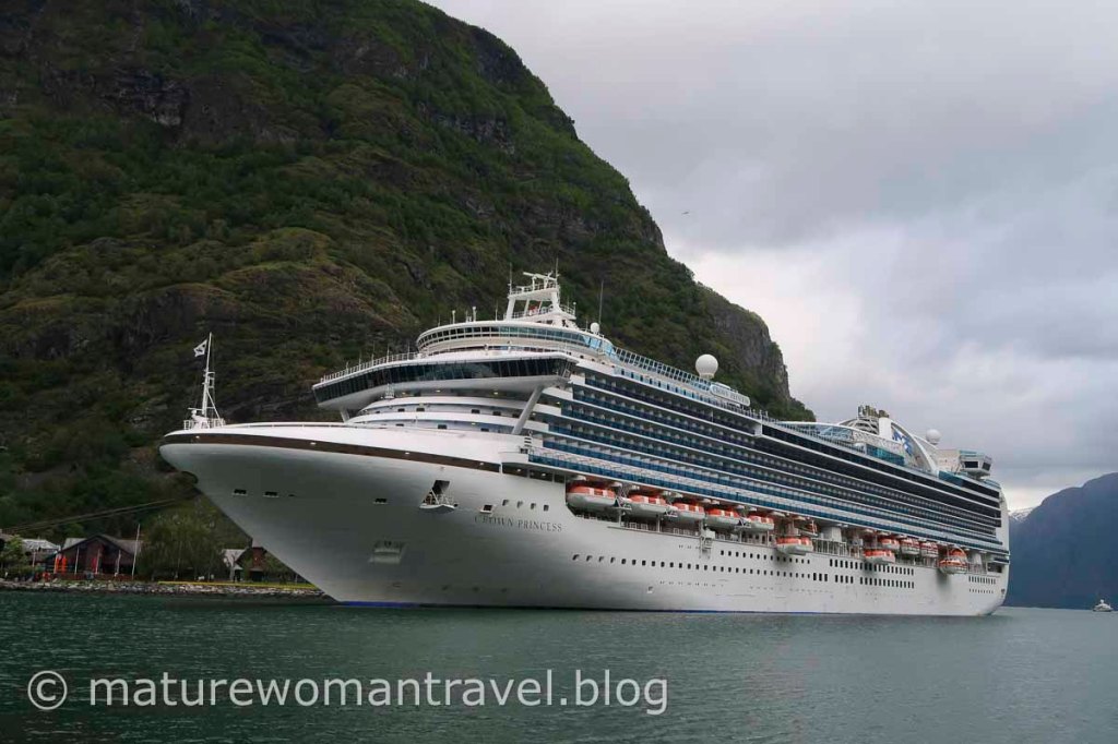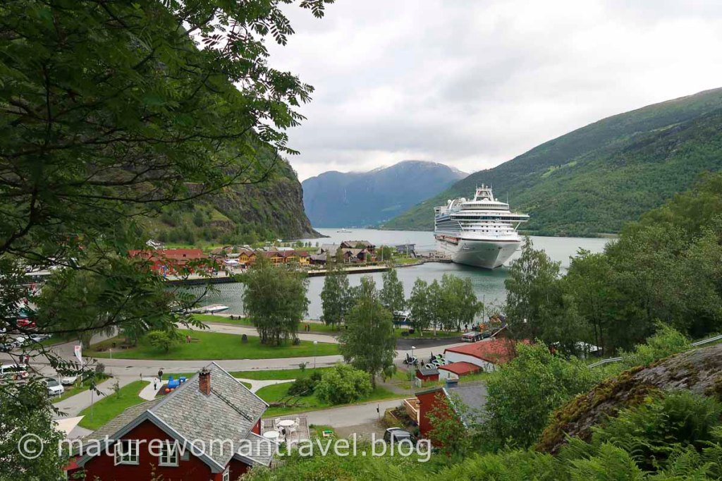沿著上坡的步道健行,爬到高處可俯瞰弗洛姆小鎮全景。郵輪為峽灣碼頭增色不少,許多遊客也紛紛來取景,大家對如畫般的美景讚嘆不已。