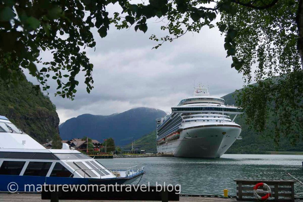準備搭乘松恩峽灣遊船的旅客們,無暇顧及行李,隨意放在商店門外,忙著捕捉美景。我們也將行李就地放在路旁,衝到碼頭欣賞壯麗的峽灣風光。
