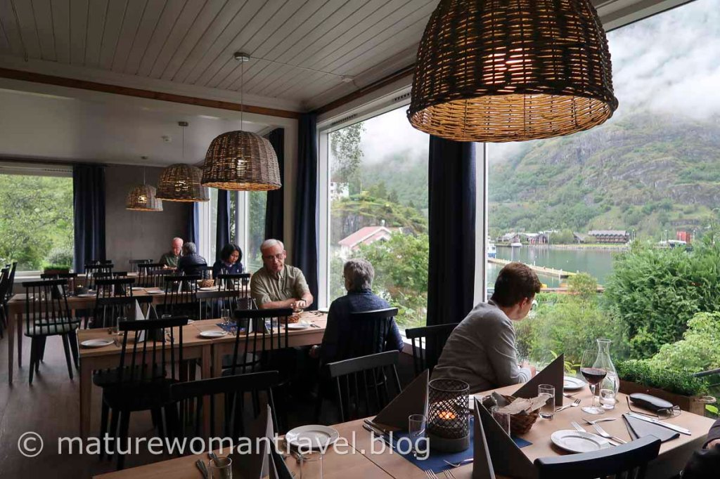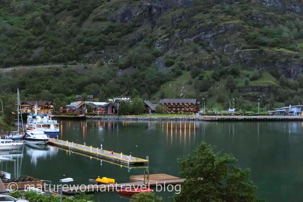 挪威縮影的行程中,遊客如考慮中途住一晚,多半會選擇弗洛姆,是搭乘峽灣遊船與高山火車的起點。小鎮不大,飯店非常熱門,能訂到面向碼頭的Heimly Pensjonat飯店的確不容易,因訂房過於踴躍,飯店還來電希望我們原訂的4人房改以3人房代替。