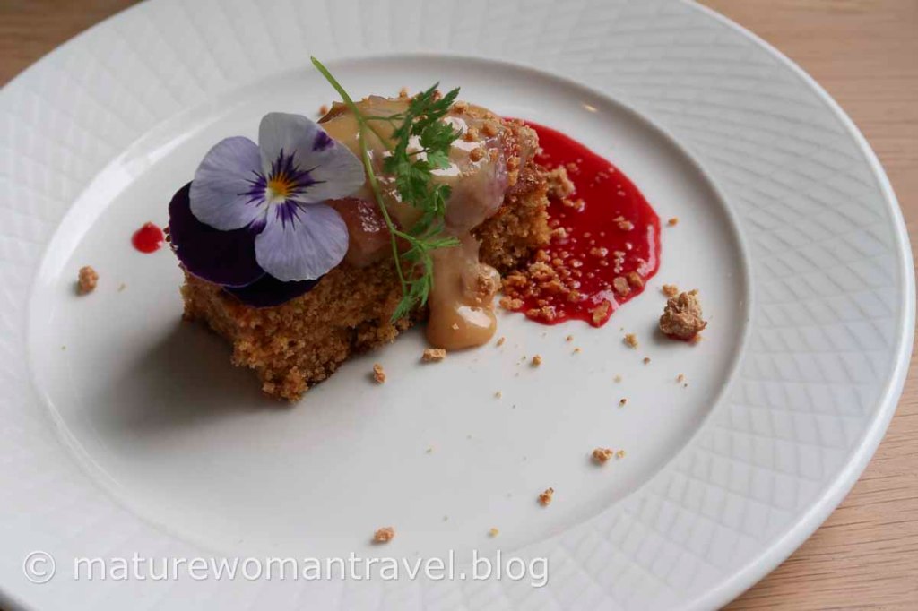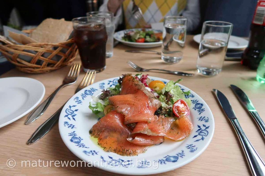前菜是煙燻鮭魚沙拉,主餐選魚料理,煎鮭魚佐烤馬鈴薯及豌豆粒,清爽健康的烹調方式,甜點蛋糕精巧美味。