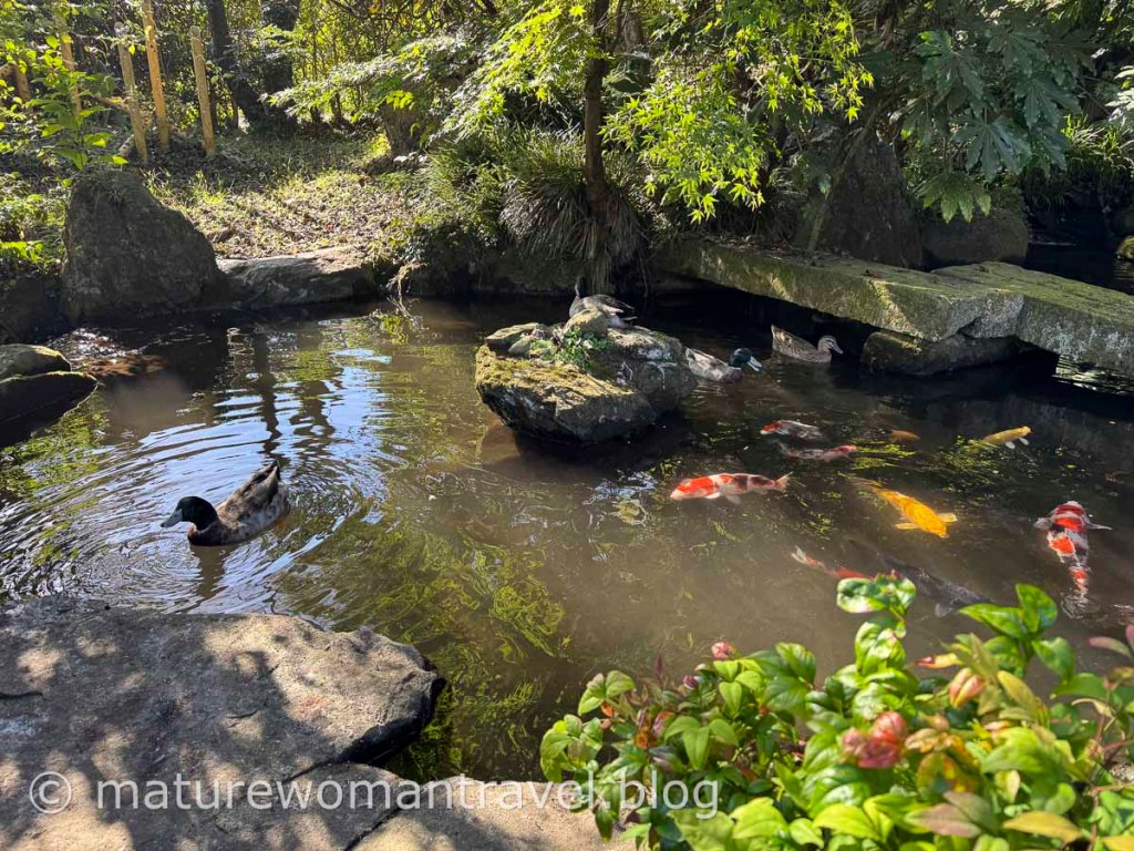 翌日早晨陽光灑滿庭院,帶著旅館提供的飼料來到池塘邊餵鴨子和魚,還沒走到池邊,群鴨已搖搖擺擺的衝過來,急著爭食早餐,想留半杯飼料餵魚,但灑入池塘,魚兒來不及吃卻被群鴨搶食,魚兒顯得淡定依然悠游水中。