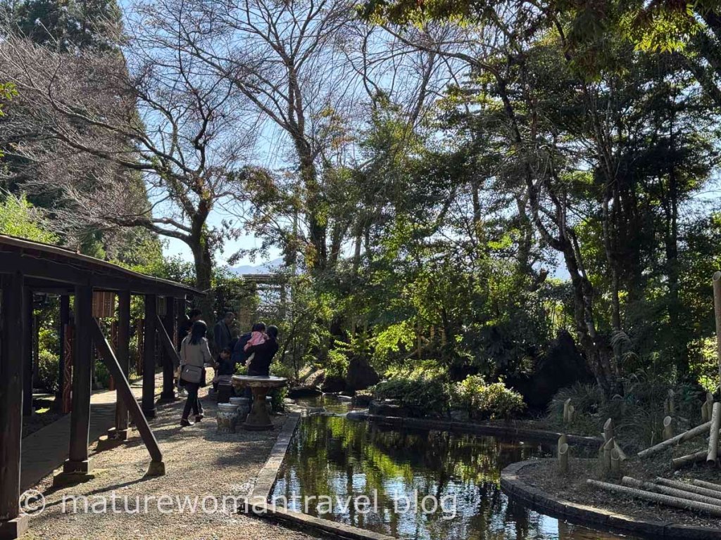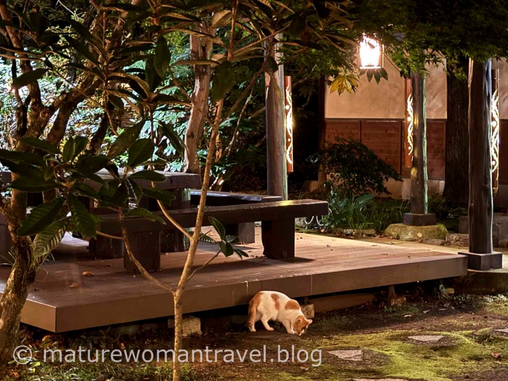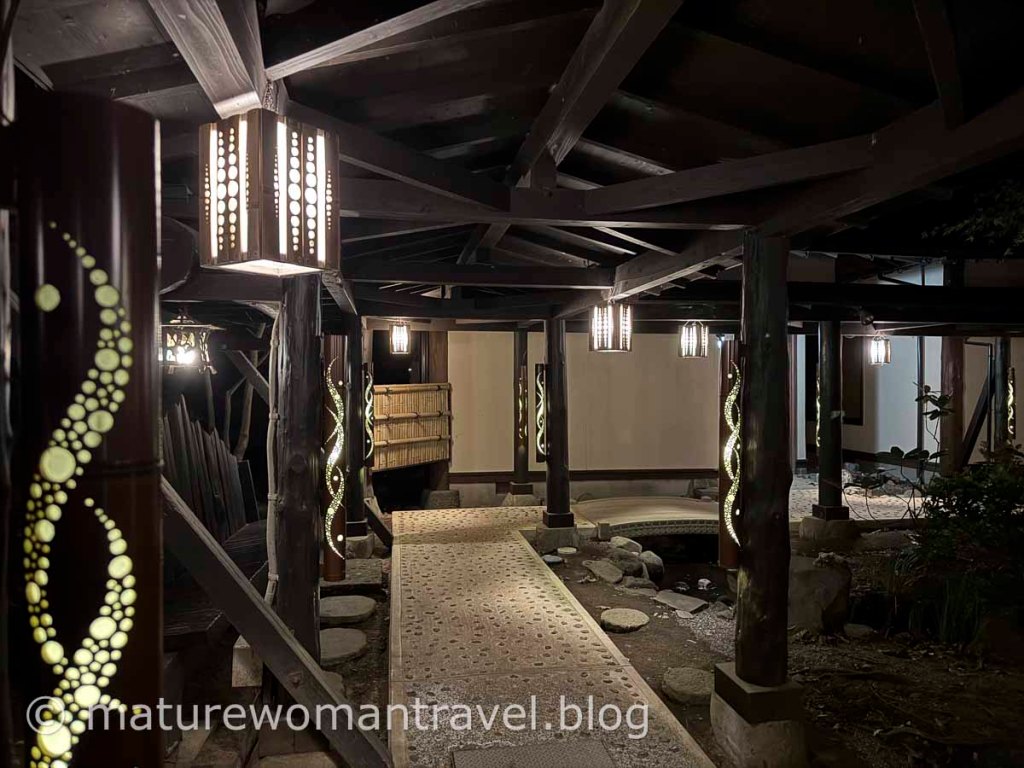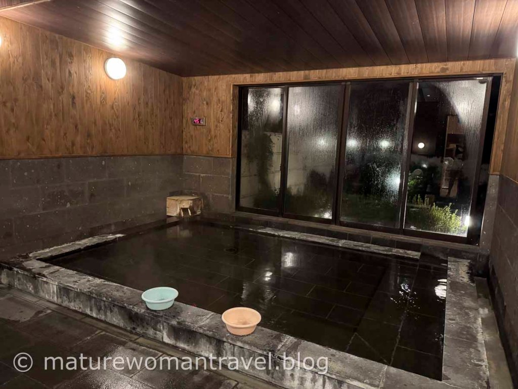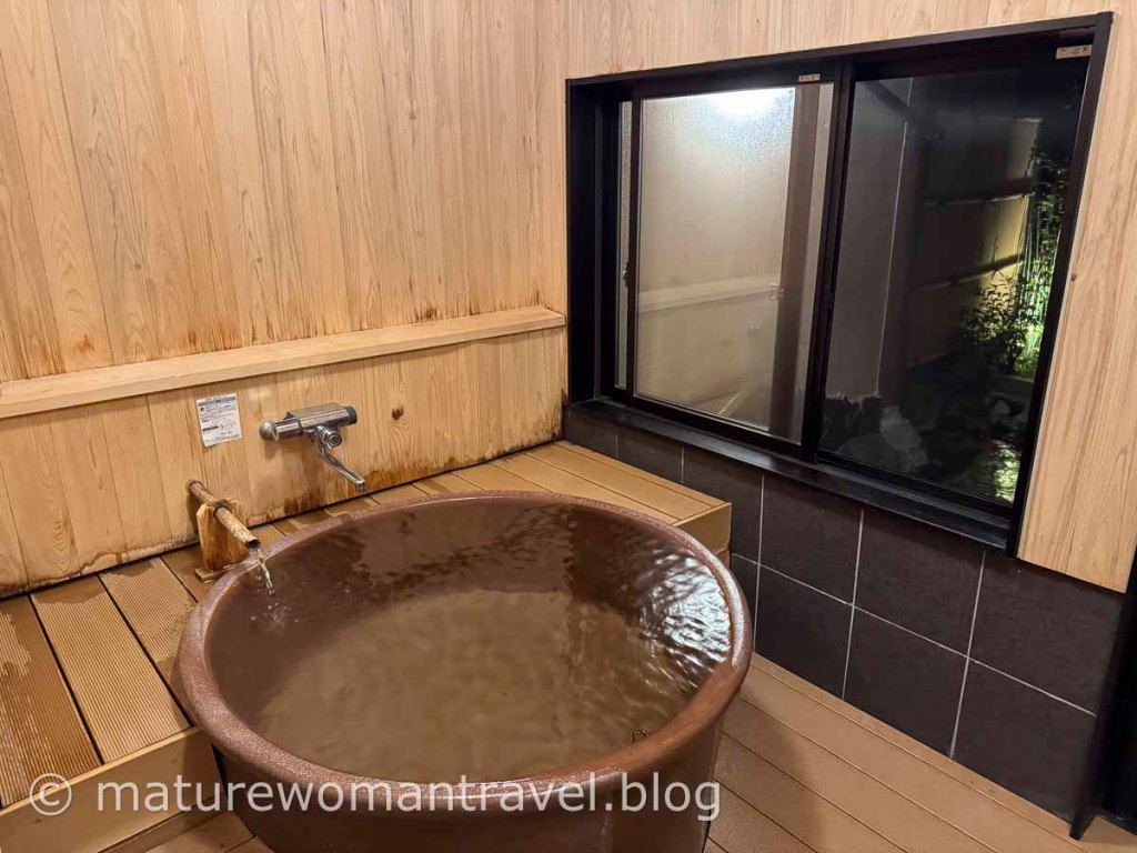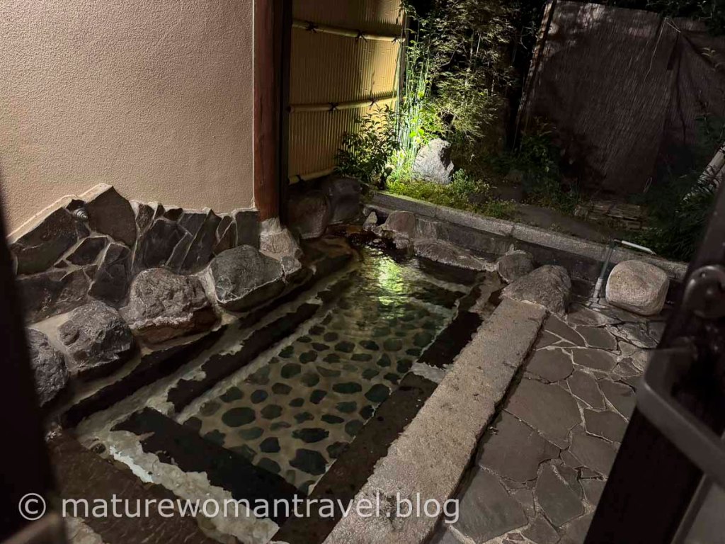 房間設有私人湯屋,室內是圓形溫泉池,戶外小庭院有長型船湯,溫泉溫度稍低些,微溫的鹼性溫泉,沈浸其中放鬆身心,並且對美化皮膚有很好的效果。
