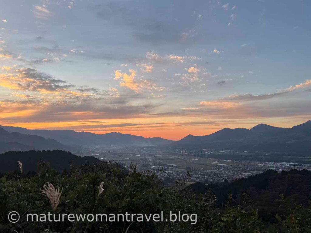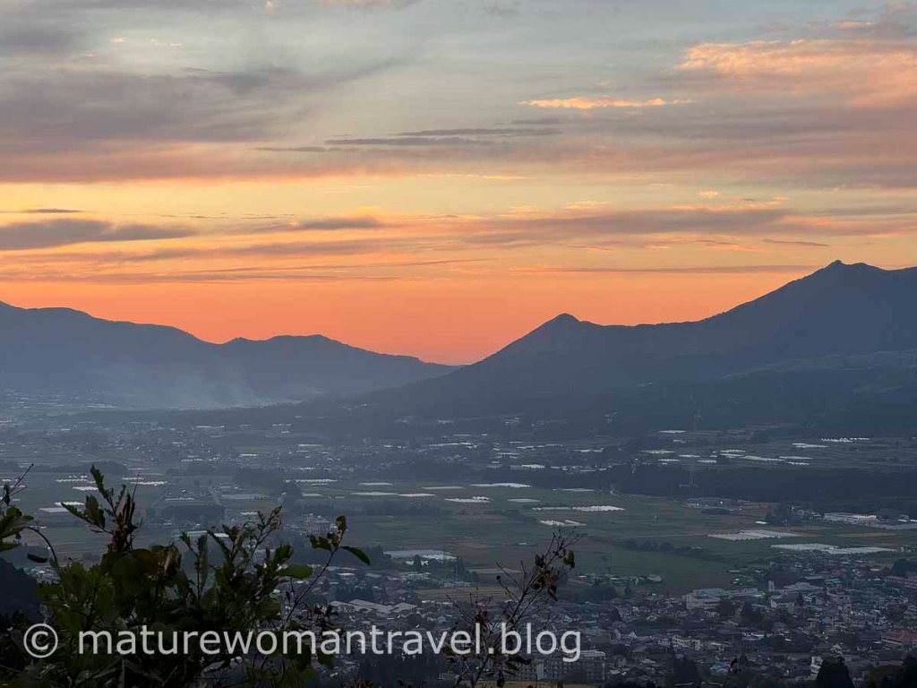 走出隧道已近黃昏,距晚餐尚有1個小時,車經過一小段蜿蜒山路來到阿蘇くじゅう国立公園高森展望所,景觀豁然開朗,夕陽餘暉染紅阿蘇山層峰的天際線,讃嘆渾然天成的大自然美景。