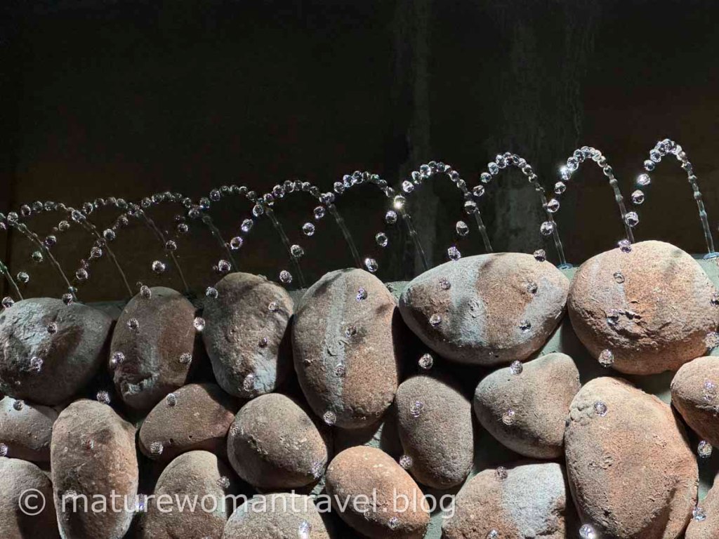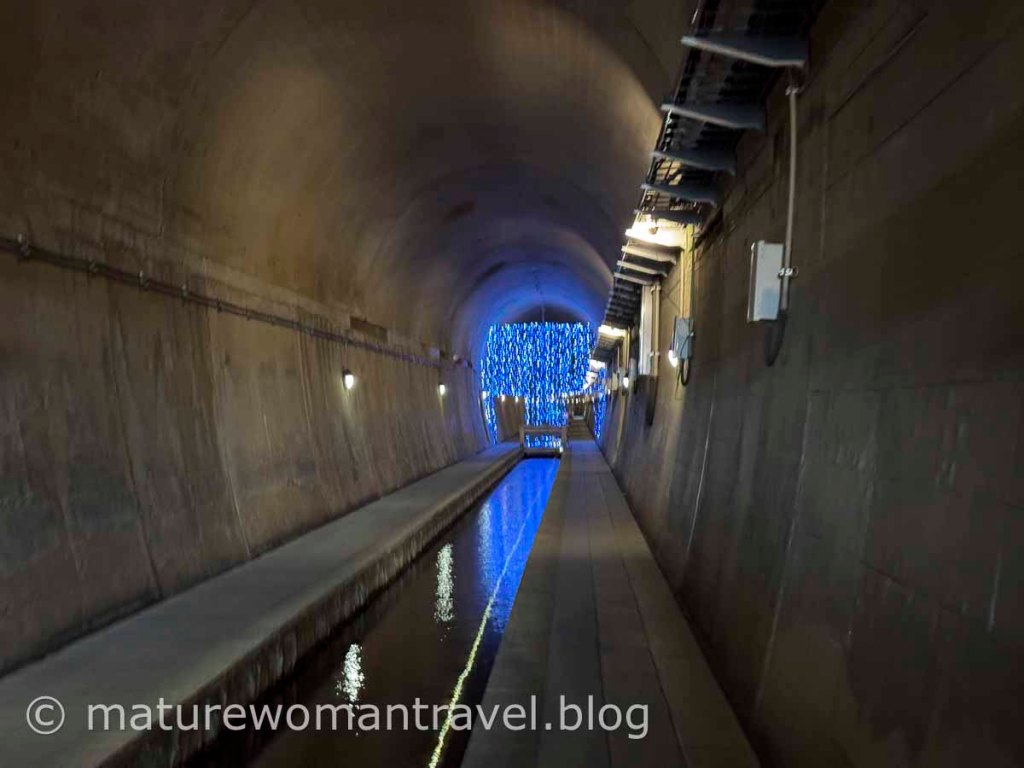 在全長2公里的隧道中,約1公里被規劃成公園,毎分鐘沿著木製步道流過的水量有32噸。每年平均溫度17°C,在隧道的盡頭中,您可以看到從挖掘後的岩盤流出有如瀑布的水源。此外,前方還設有透過水流及特殊閃光燈效果,形成美麗的「水珍珠」藝術作品。