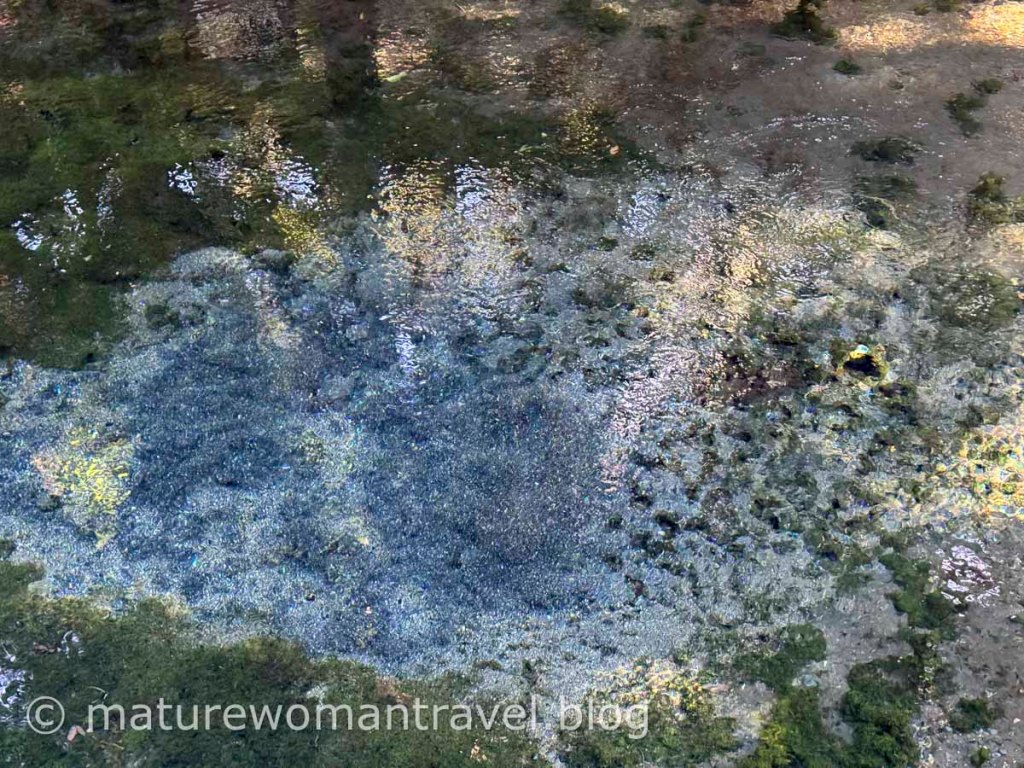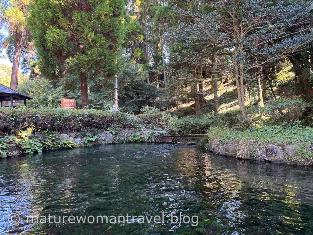 沿途樹木蓊鬱,伴隨著淙淙的水流聲,付了每人100日幣的門票,可見湧泉的源頭,清澈見底的池底不斷湧出泉水,旁邊放置勺子,可以自由取用泉水。看到其他遊客取水飲用,女兒也拿出隨身攜帶的保溫杯裝一瓢泉水喝看看,果然和旅館喝的水一樣清甜。