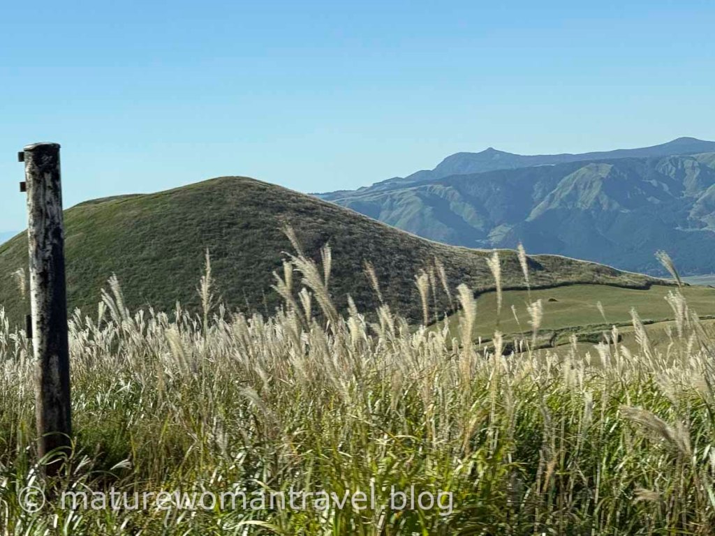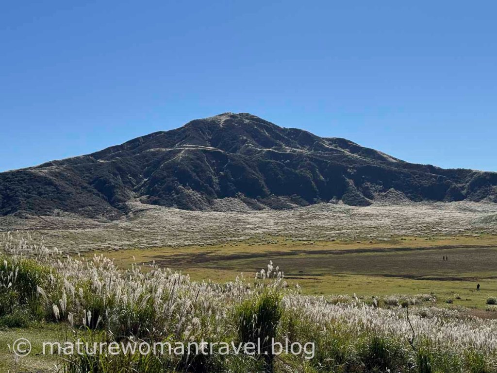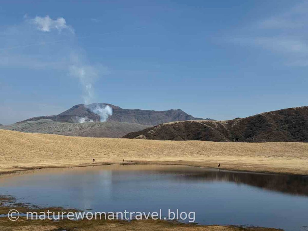 秋天的草千里之濱長滿開花的芒草,池塘水已乾涸,相較去年春初造訪時,這片草原全是枯黃,池水倒映山景及正冒著陣陣白煙的火山口,景色各有千秋。
