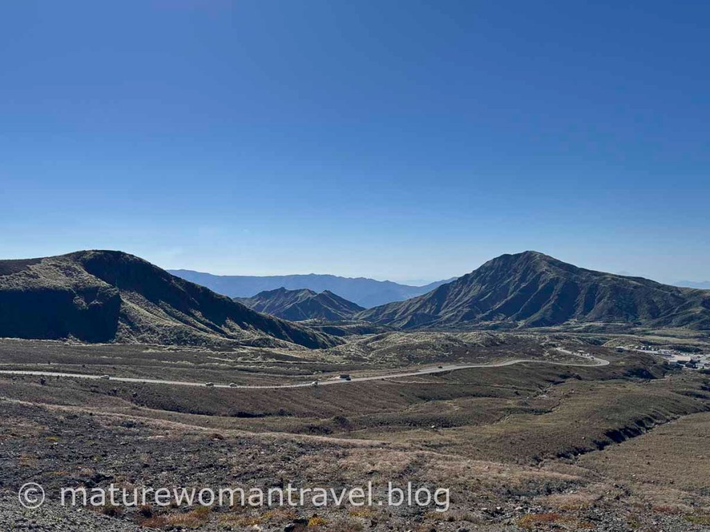 車沿著111県道下山,在阿蘇車站前轉入 212號國道,車盤旋向上登上大觀峰展望所,可俯瞰壯觀的阿蘇山火山口和周圍山谷的觀景點。