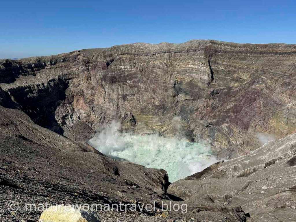 中岳直徑600m,深130m。在周長4公里的巨大火山口,可以近距離看到濃烈的白煙升騰,動態的景色。