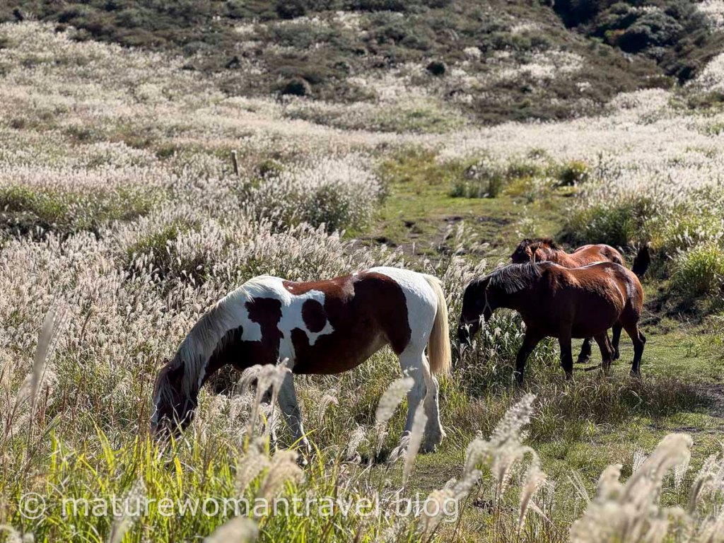 許多遊客在草原上散步,卻未見馬匹行走,我們爬上山坡視野遼闊,再往深處走驚喜的發現遠處草叢有幾匹駿馬正低頭吃草。