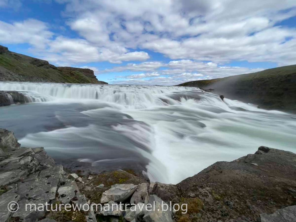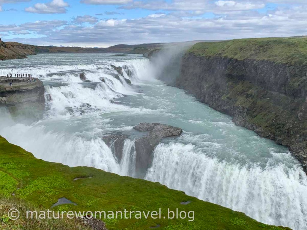 愈接近瀑布濺起的水花隨風飄散,時不時會被水珠打在身上。河面非常寬廣,兩段斷層的瀑布氣勢磅薄壯觀。近距離聆聽洶湧澎湃的水聲令人震撼。冰島的自然奇景深深吸引來自全球的旅客造訪。