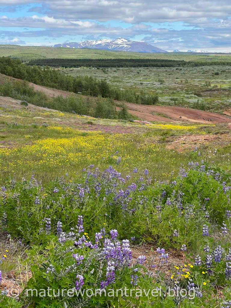 經過斯特羅柯間歇再向上坡走,視野更加遼闊,近處草地上搖曳的紫色、黃色小花,延伸到遠處積雪的山峰,大自然的美景令人心曠神怡。