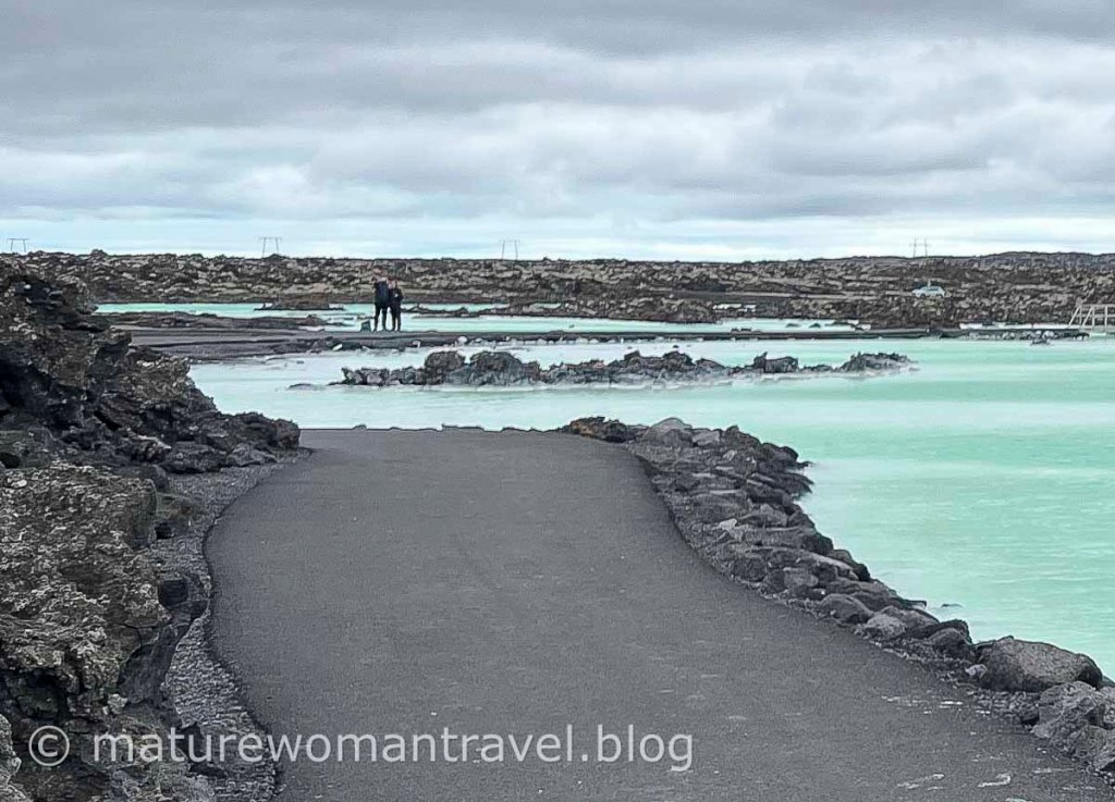 穿過黑色熔岩礫石間,眼前出現藍色的湖水,像加了牛奶般,呈現非常誘人的溫泉色澤。