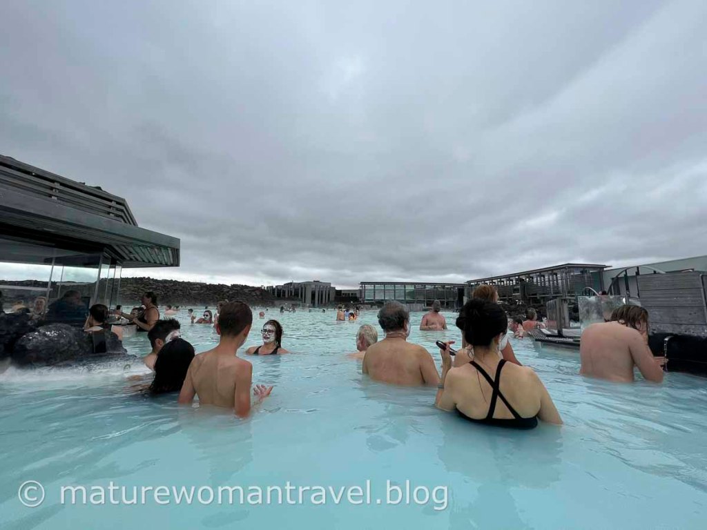 乳藍色的溫泉水溫不會太高,水質溫潤沒有硫磺味,池邊較淺些,但往池中央走越來越深,對於個子不高又不黯水性的我,水浮力讓人站不穩。